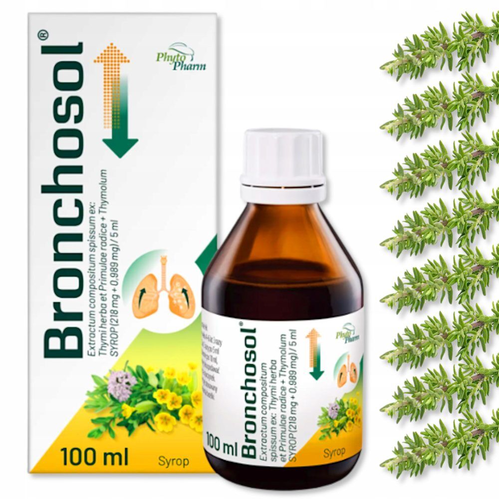 Bronchosol (100 m:l) to lek do leczenia kaszlu, w postaci syropu, odpowiedniego do stosowania u osób dorosłych i dzieci powyżej 4. roku życia. Składniki aktywne produktu leczniczego Bronchosol to wyciąg z ziela tymianku, wyciąg z korzeni pierwiosnka oraz tymol. Lek ten jest stosowany tradycyjnie w charakterze środka wykrztuśnego i pobudzającego wydzielanie płynnego śluzu w oskrzelach. Brochonsol to tradycyjny lek roślinny, którego skuteczność polega wyłącznie na doświadczeniu z długiego okresu stosowania.