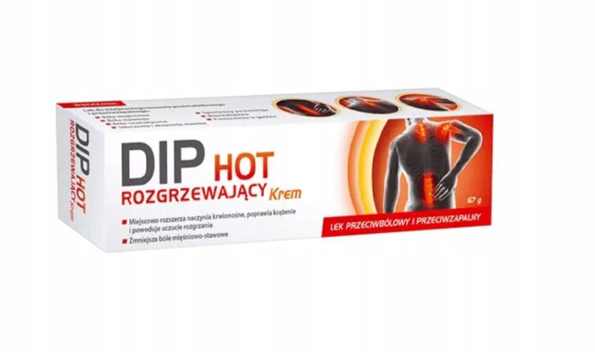 Dip Hot Rozgrzewający jest lekiem o skojarzonym działaniu czterech substancji czynnych: salicylanu metylu, mentolu, olejku eukaliptusowego, olejku terpentynowego. Jest to lek w postaci kremu o działaniu miejscowo rozgrzewającym. Salicylan metylu zawarty w leku wykazuje też działanie przeciwzapalne i przeciwbólowe. Wcieranie leku w obolałe miejsca powoduje rozszerzanie naczyń krwionośnych, poprawę krążenia i uczucie rozgrzania. Wynikiem tego jest ustępowanie lub zmniejszenie bólów mięśniowych i stawowych.